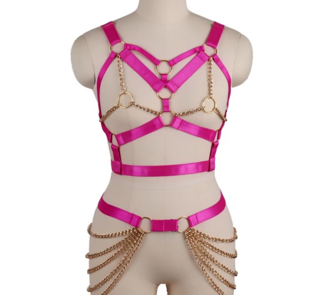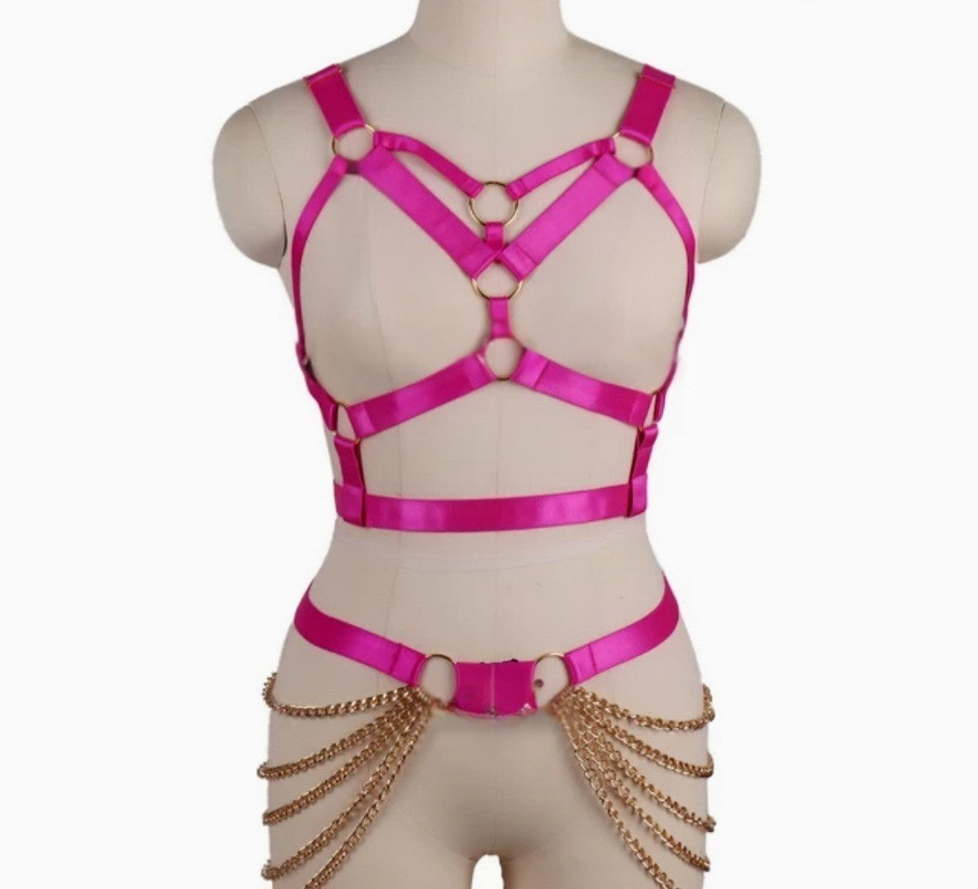 Satin harness, glass rhinestones, bold metal chains & rings, its lightweight, adjustable, made to move with you.