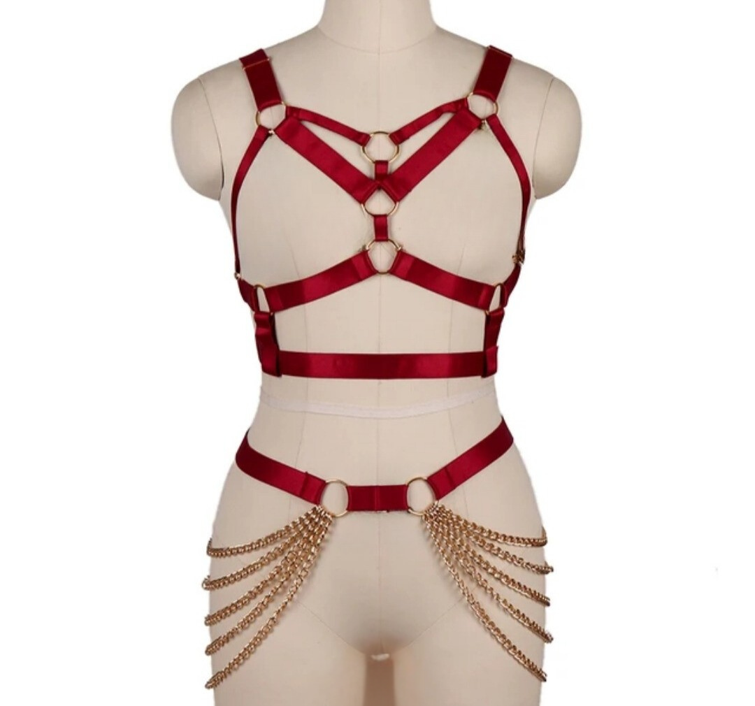 Satin harness, glass rhinestones, bold metal chains & rings, its lightweight, adjustable, made to move with you.