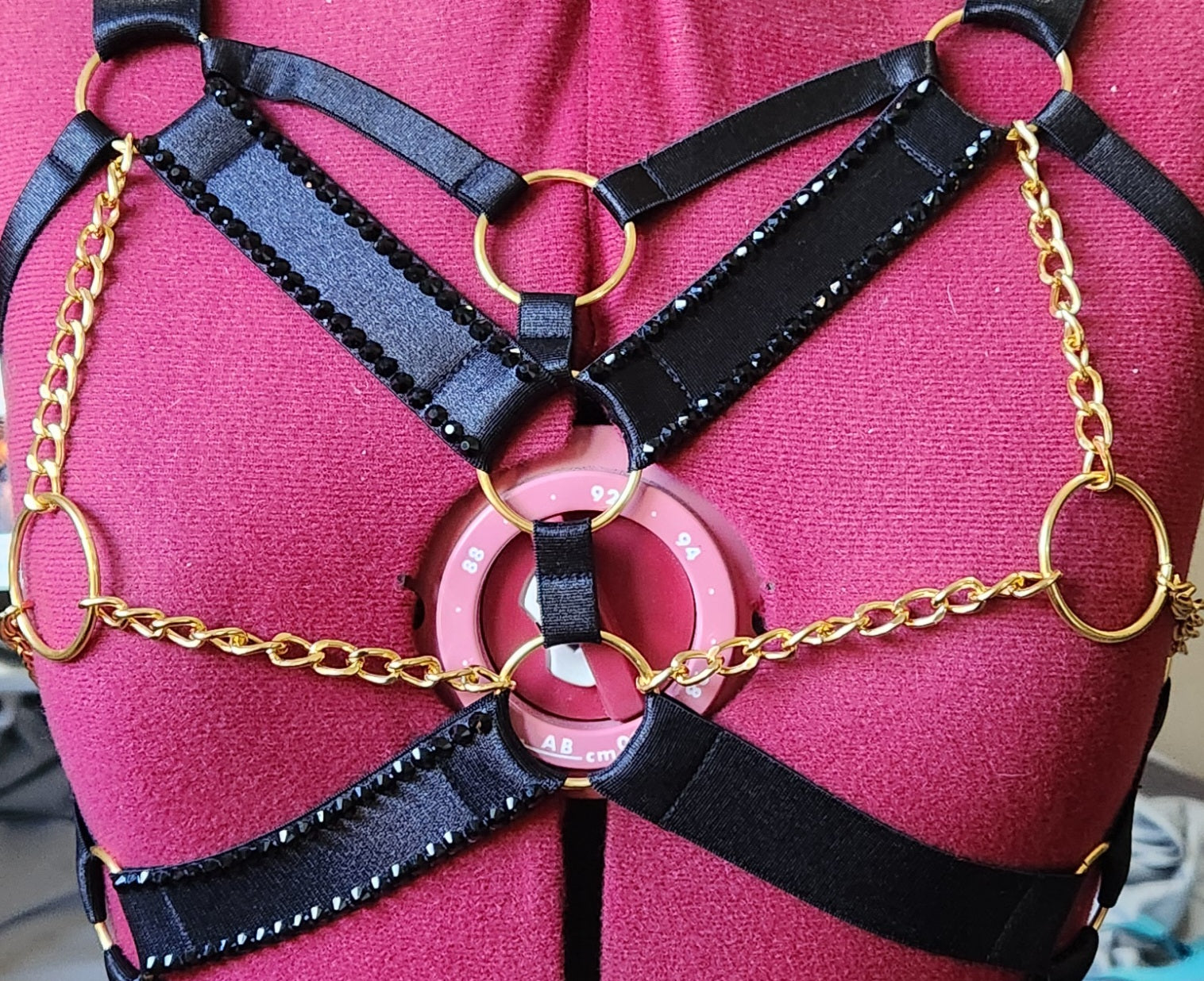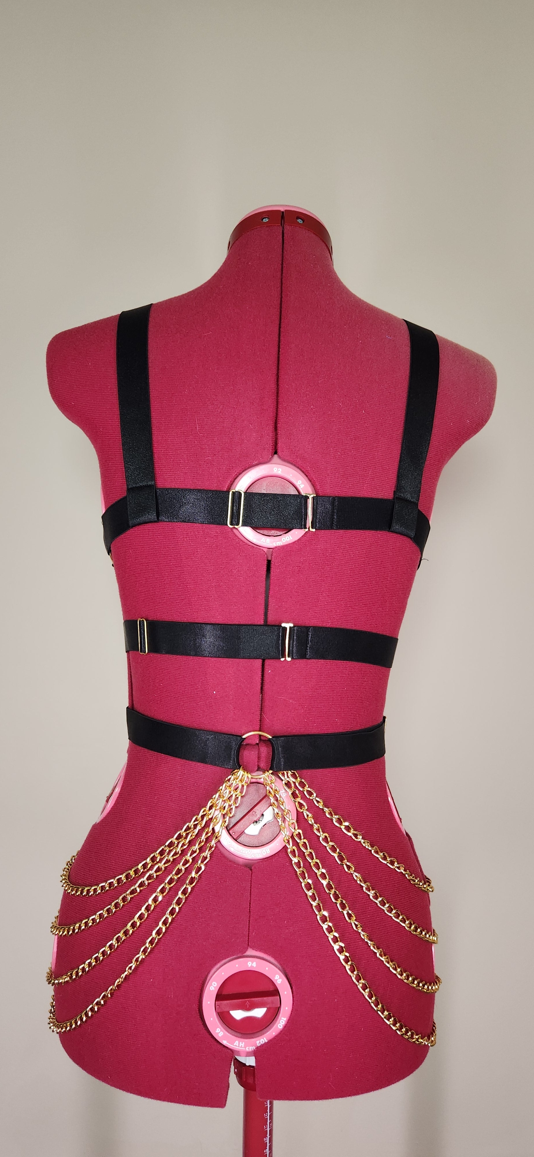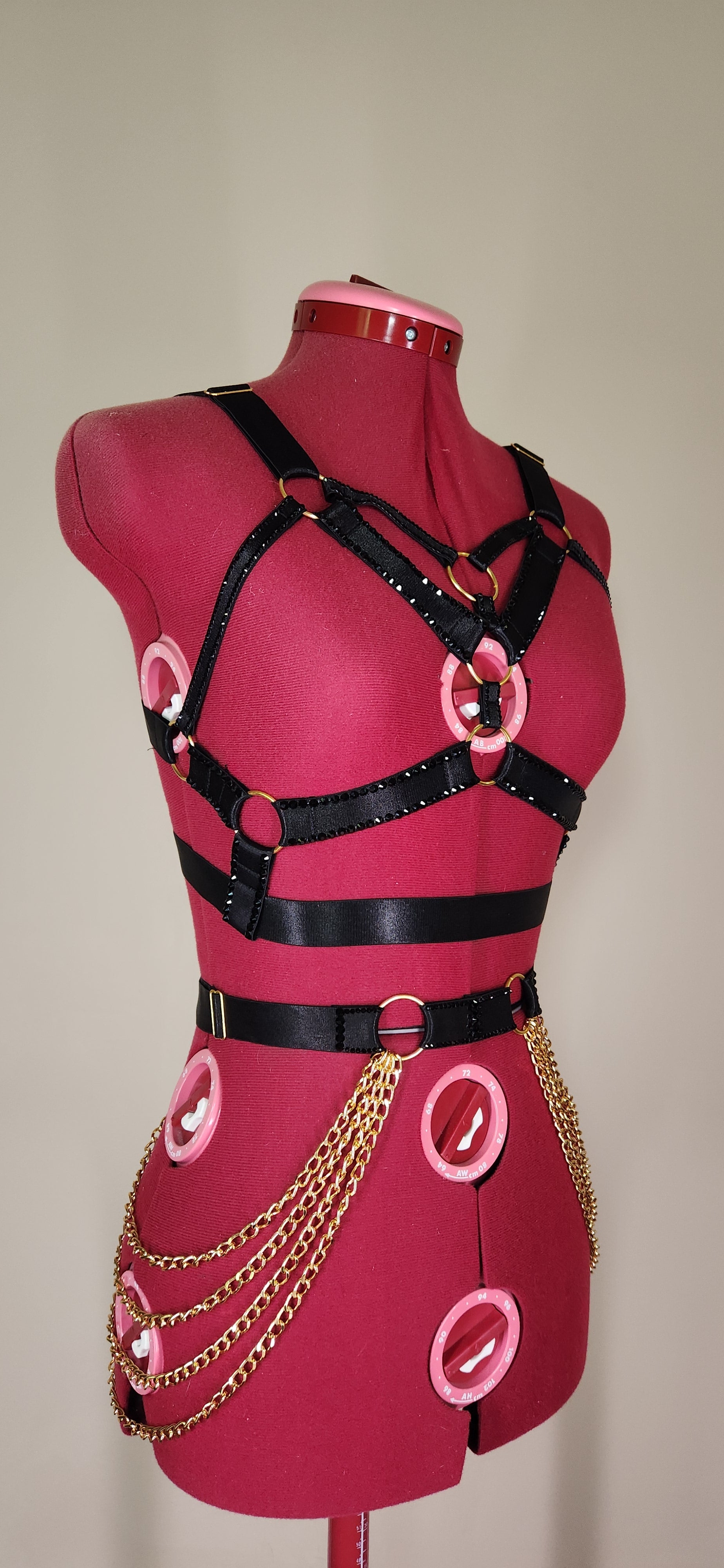 Satin harness, glass rhinestones, bold metal chains & rings, its lightweight, adjustable, made to move with you.