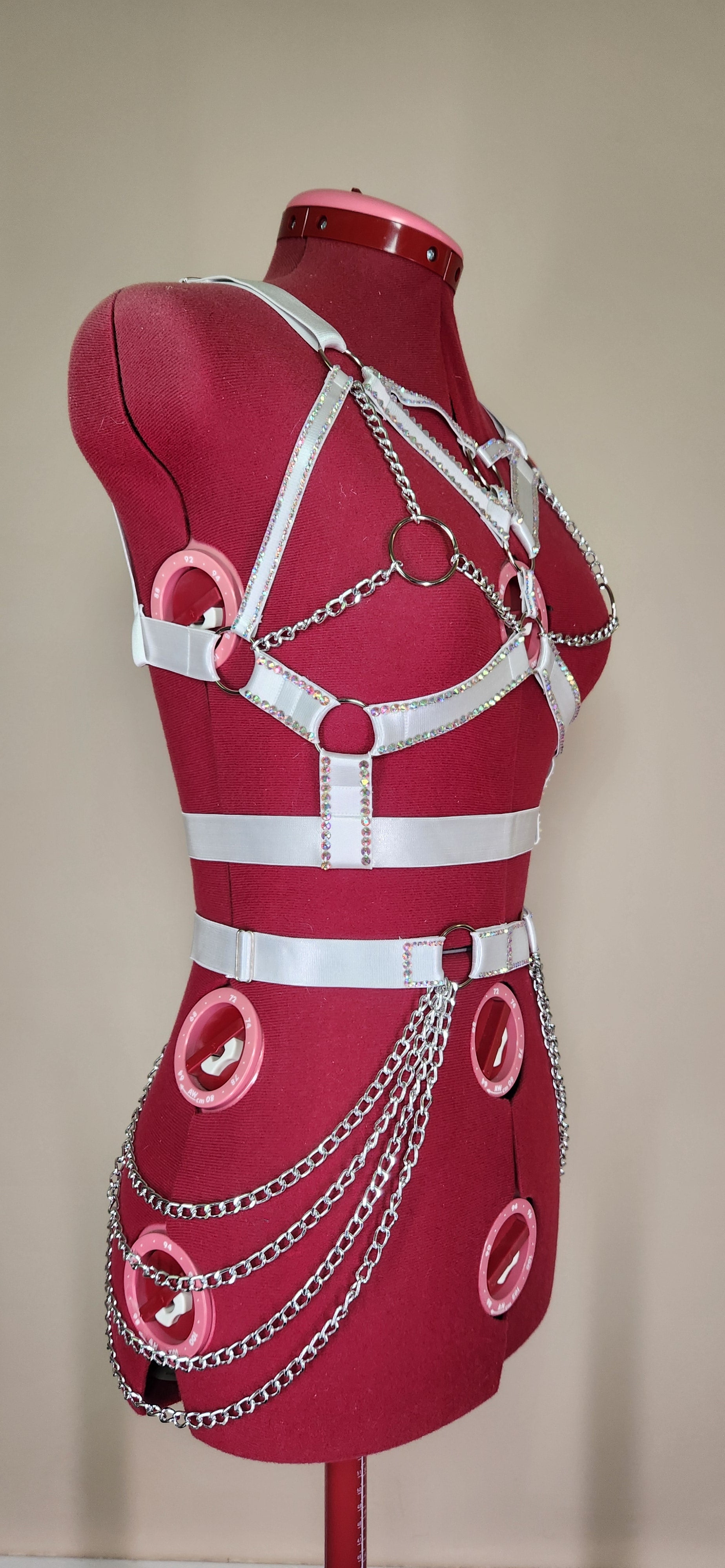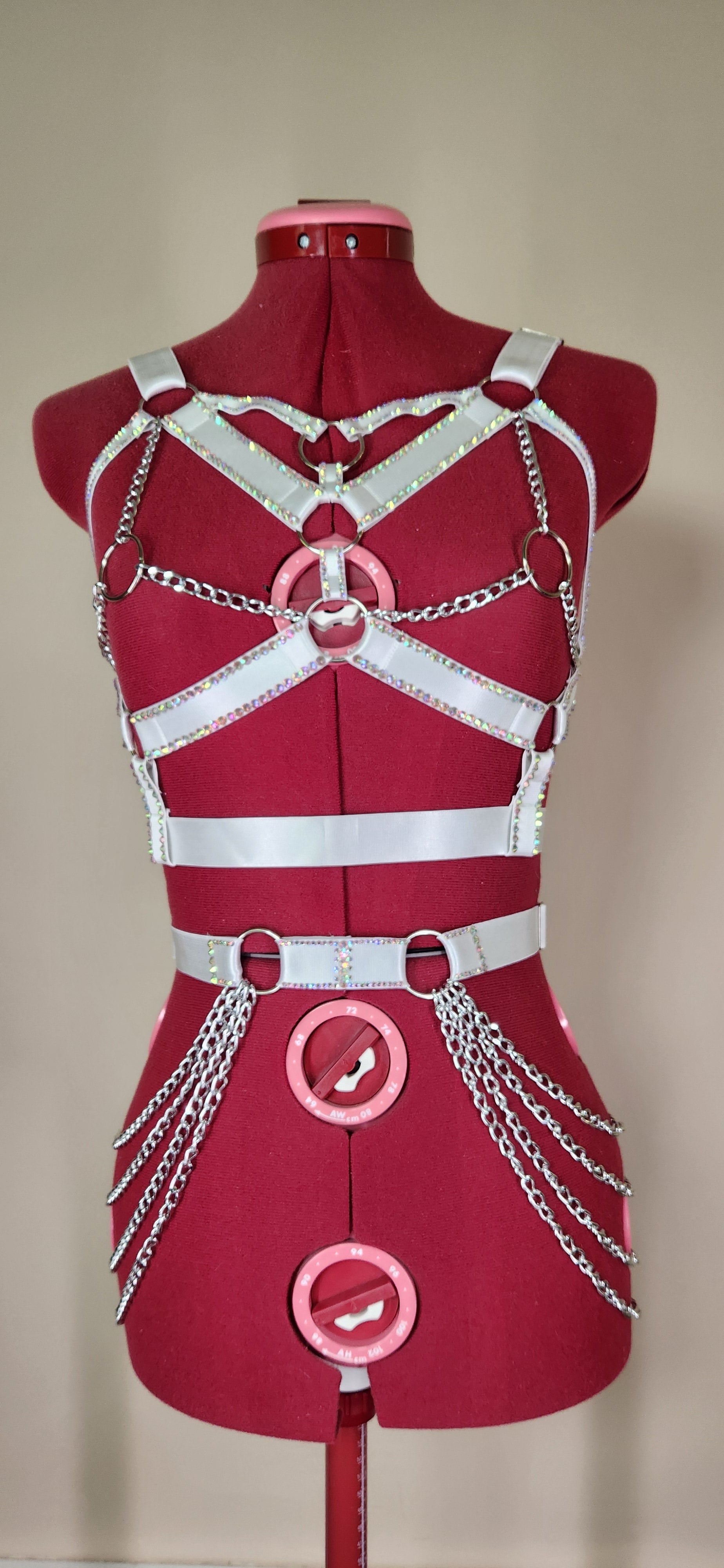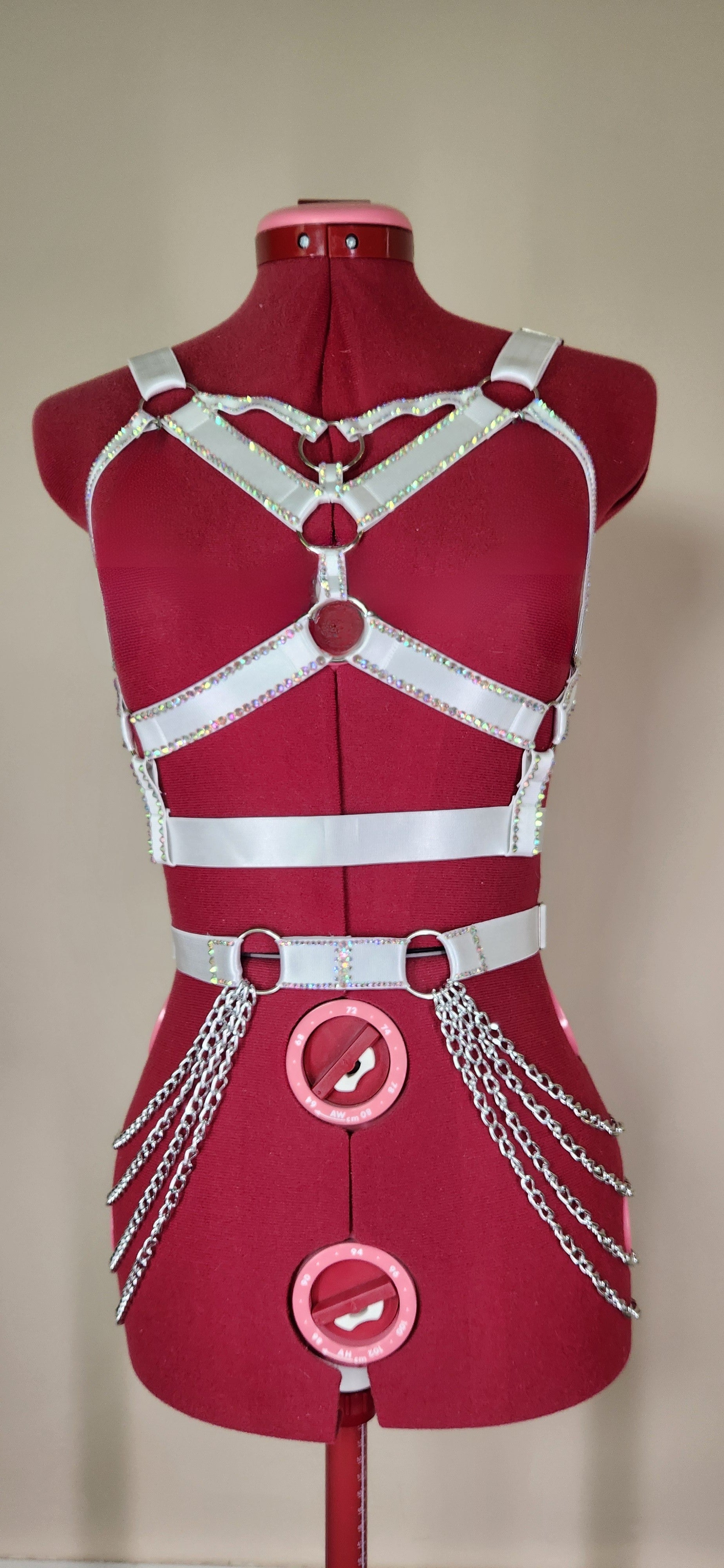 Satin harness, glass rhinestones, bold metal chains & rings, its lightweight, adjustable, made to move with you.