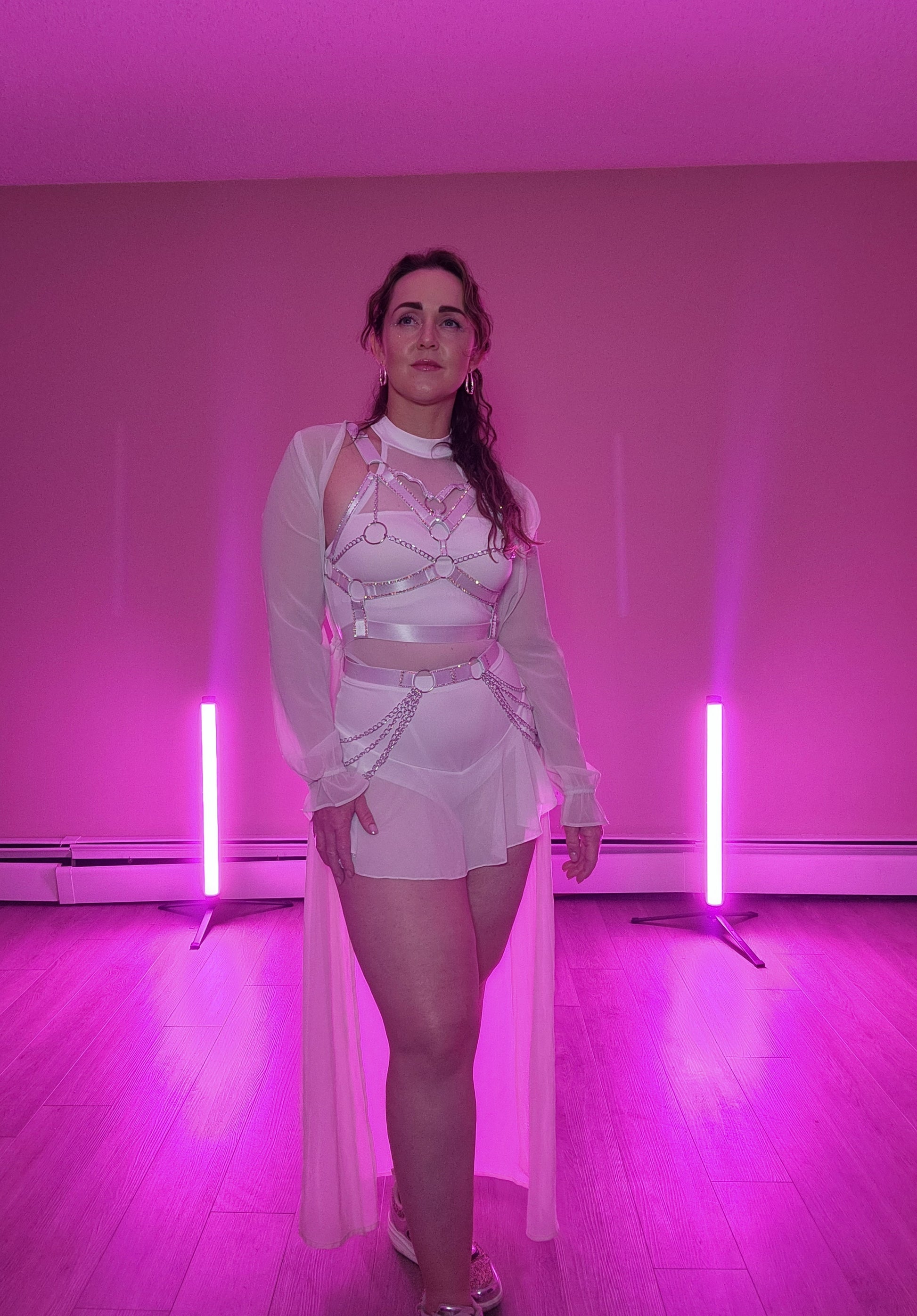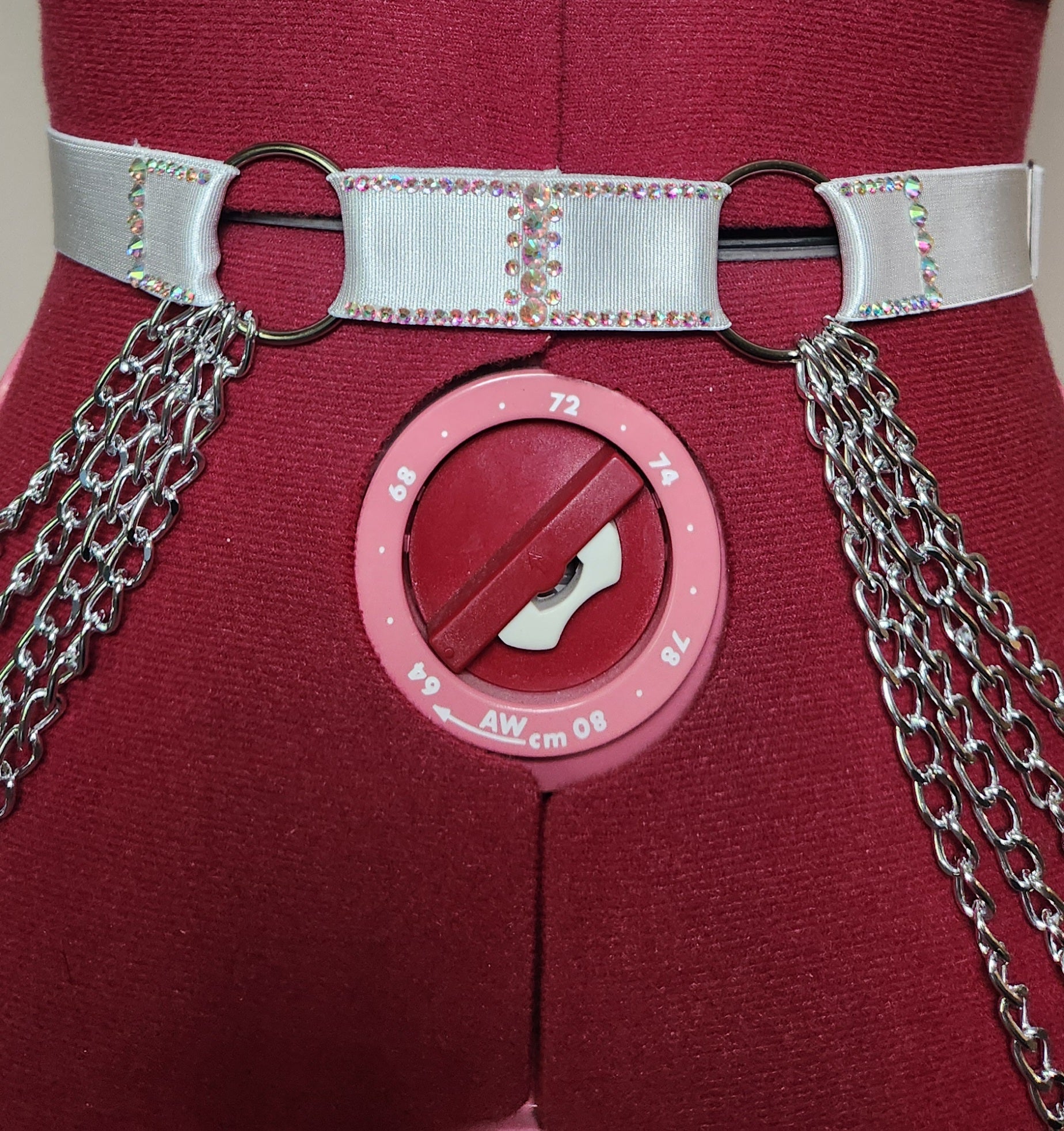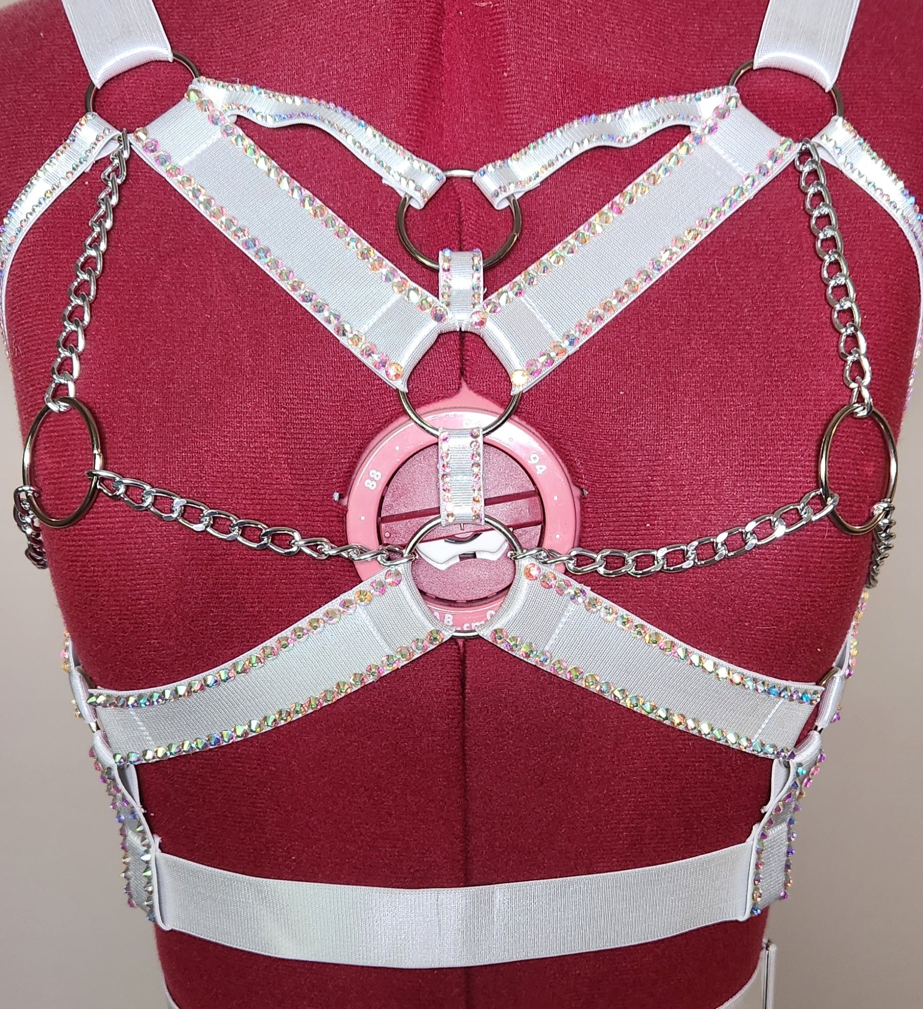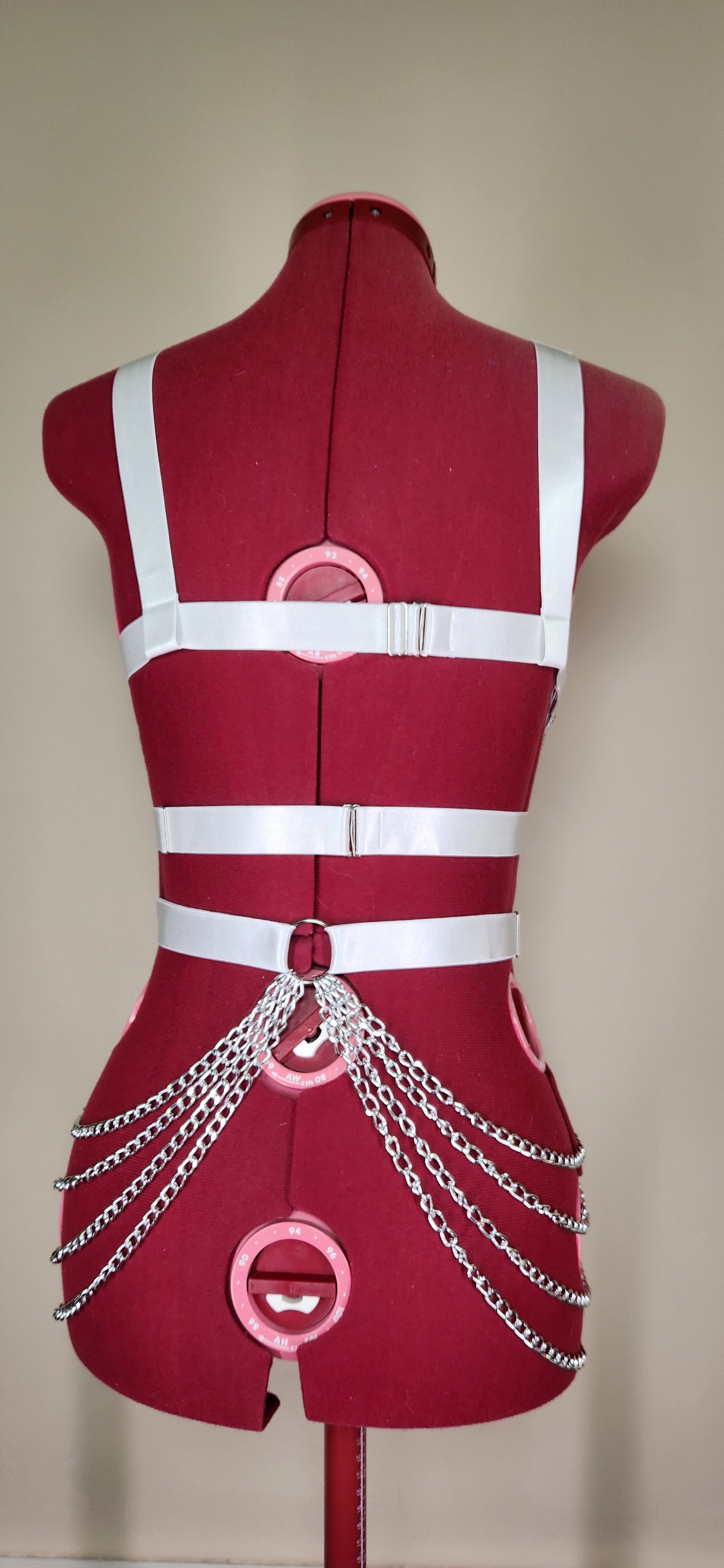 Satin harness, glass rhinestones, bold metal chains & rings, its lightweight, adjustable, made to move with you.